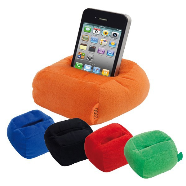 Soporte puff para smartphone en suave poliéster relleno de bolitas y en llamativos colores. Con etiqueta lateral para marcaje.