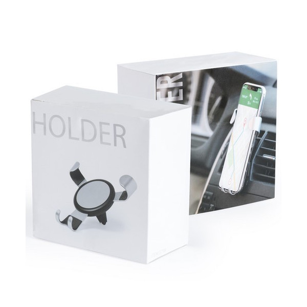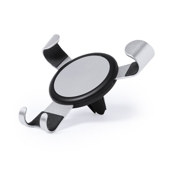 Ingenioso soporte para smartphone de diseño minimalista y elegante acabado en aluminio. Con sistema de fijación universal que se activa por el propio peso del teléfono, ajustando las pinzas de agarre una vez que se sitúa el dispositivo en el soporte. Para rejilla de ventilación del automóvil y con pastilla circular frontal especialmente diseñada para marcaje en tampografía.