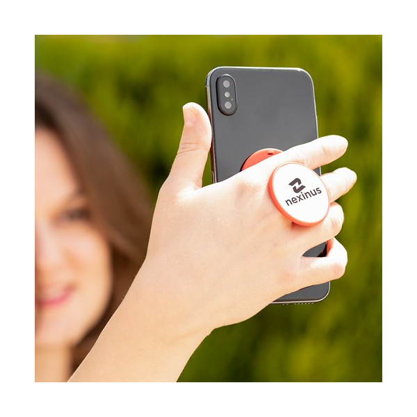Soporte selfie en plástico ABS para smartphone. De llamativo diseño, disponible en extensa gama de colores y con adhesivo 3M, de fijación extra fuerte y libre de residuos al despegarlo del dispositivo. Con soporte posterior para los dedos.