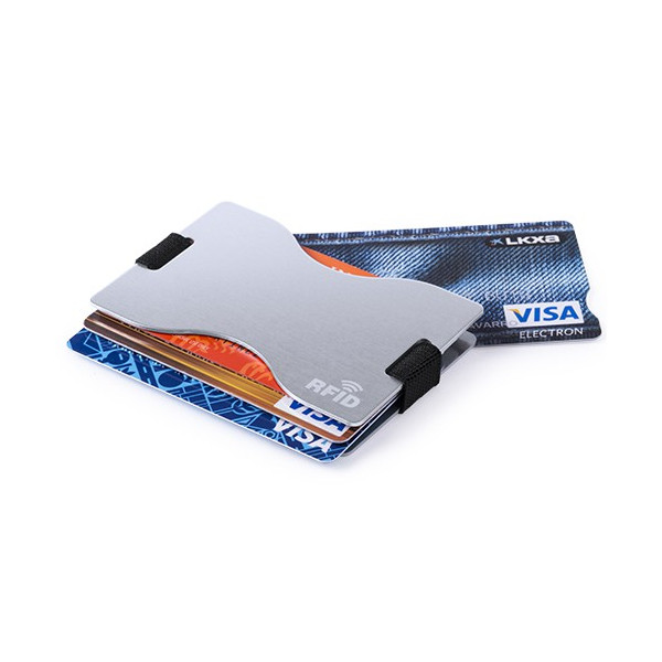 Tarjetero con tecnología de seguridad RFID (Identificación por Radio Frecuencia) que mantiene seguros tus dispositivos de transmisión de identidad. Resistente cuerpo doble de acabado en aluminio brillante con sistema de fijación mediante bandas elásticas y diseñado para almacenar varias tarjetas.