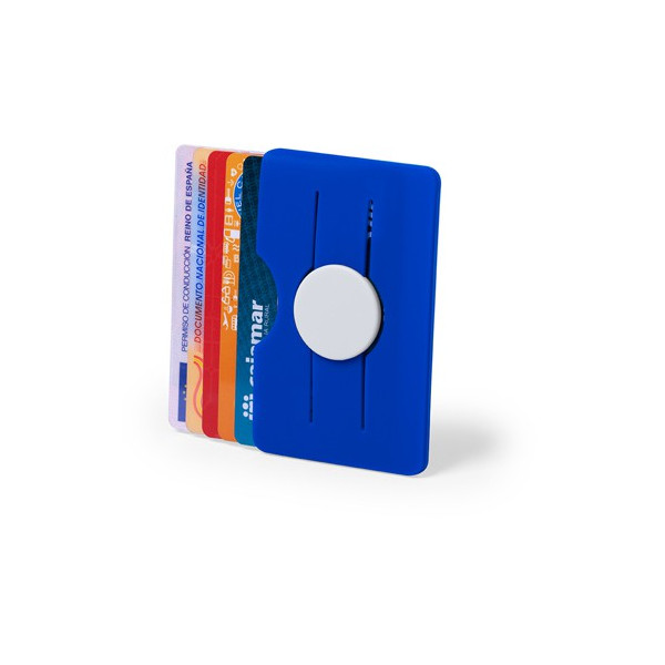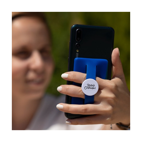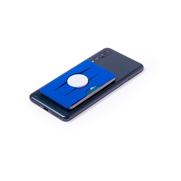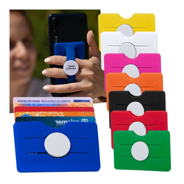 Tarjetero con sporte para smartphone. En materiales ABS y silicona, con adhesivo 3M, de fijación extra fuerte y libre de residuos al despegarlo del dispositivo. Tarjetero con capacidad para 4-5 tarjetas y disponible en llamativos colores, con soporte para los dedos en color blanco.
