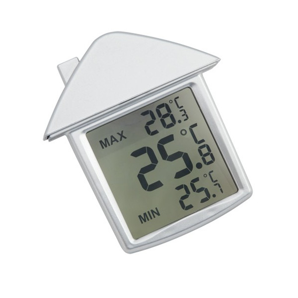 Termómetro digital de original diseño y fijación mediante ventosa situada en la parte posterior. Con registro de temperaturas máxima y mínima. Pilas de botón incluidas con film protector y presentado en caja individual negra.