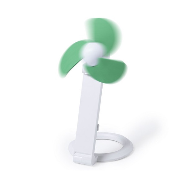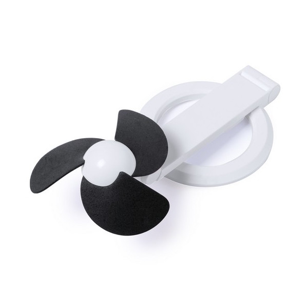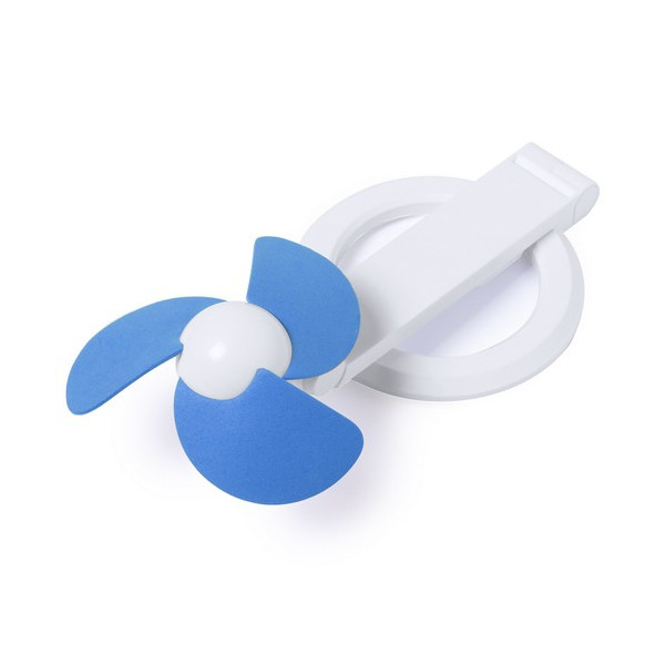 Práctico ventilador plegable de atrevido diseño bicolor y aspas de espuma EVA, con pie antideslizante. Alimentación por USB y presentado en caja individual.