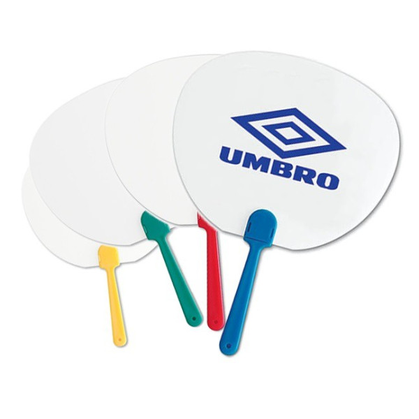 Abanico - PaiPai con superficie en color blanco de acabado translúcido y mango en variada gama de vivos colores.