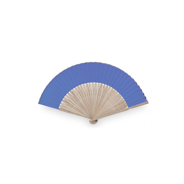 Abanico de varillas de madera troquelada y tela en poliéster de variados colores.