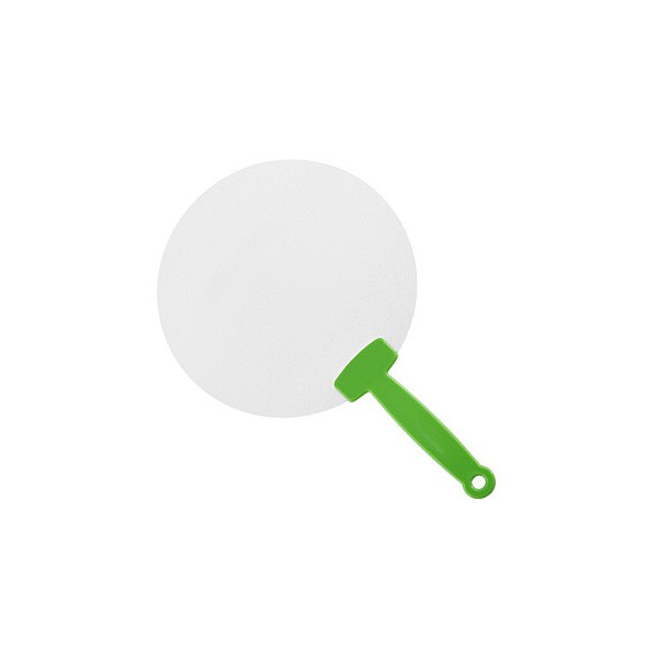 Abanico plástico de estructura semi-rigida con gran paleta para impresión y mangos de colores..