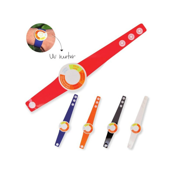 Pulsera ajustable con medidor de radiación UV en variada gama de vivos colores.