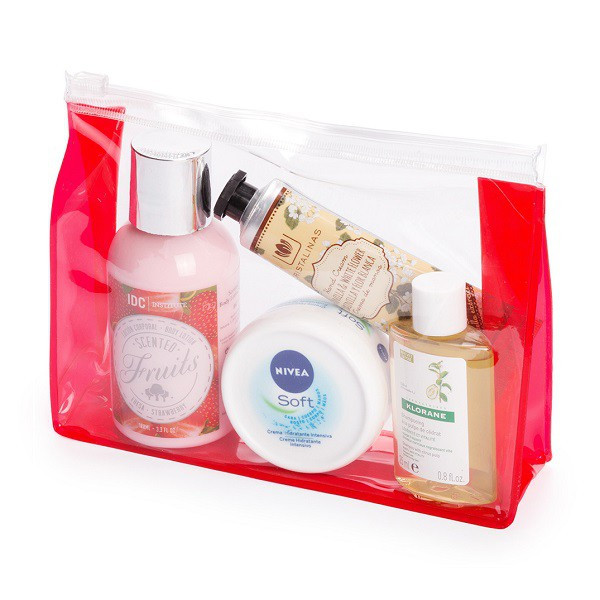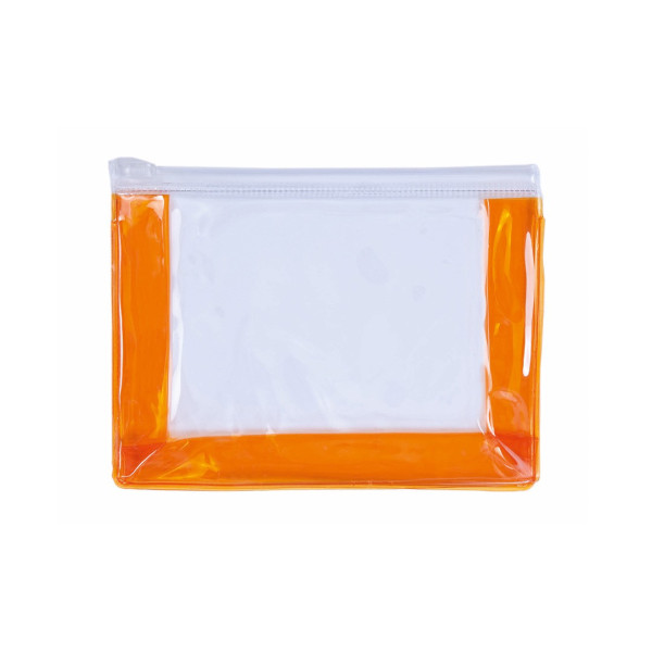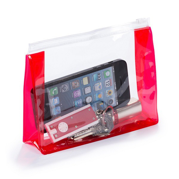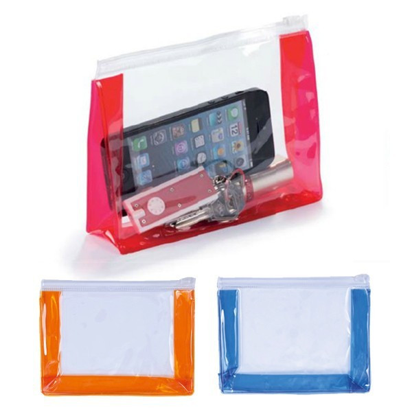 Neceser (nécessaire) multiusos en resistente PVC transparente de variada gama en vivos colores. Con laterales en color y cierre hermético.