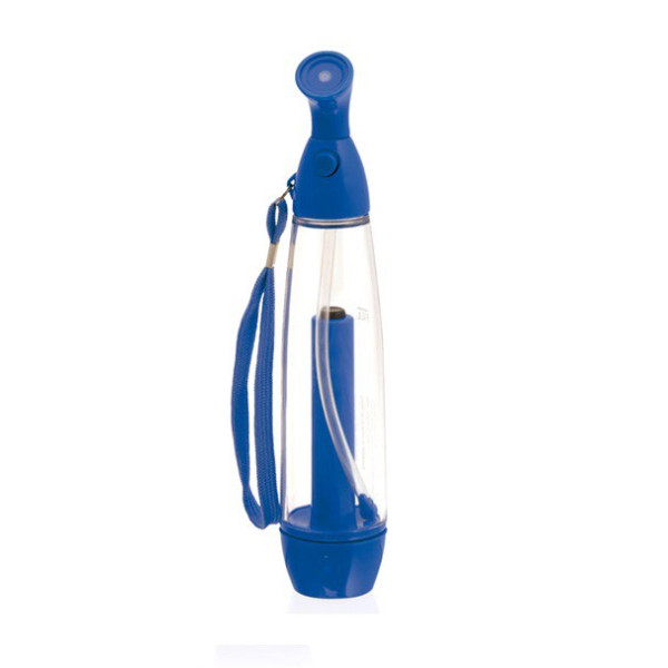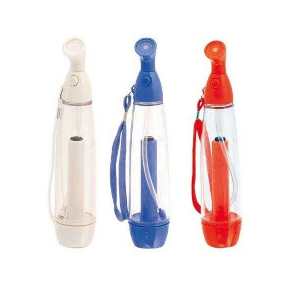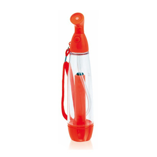 Con cuerpo en color transparente, cierre de seguridad a rosca y cinta de transporte a juego.