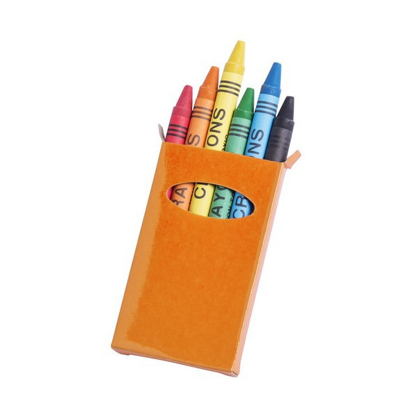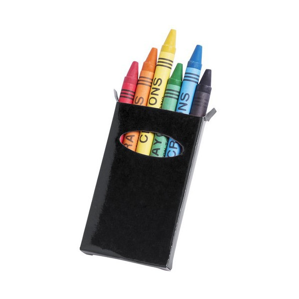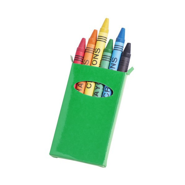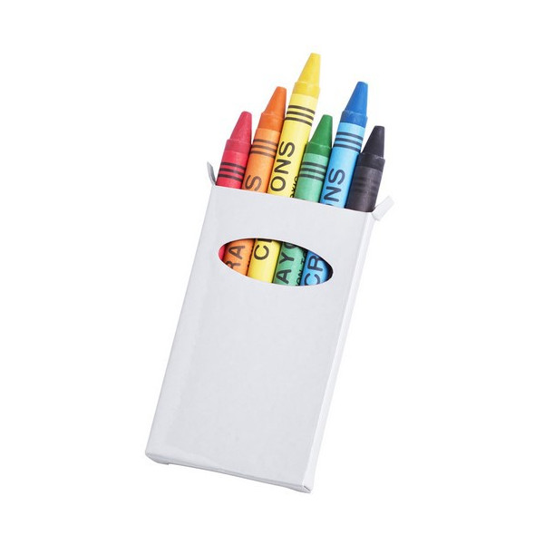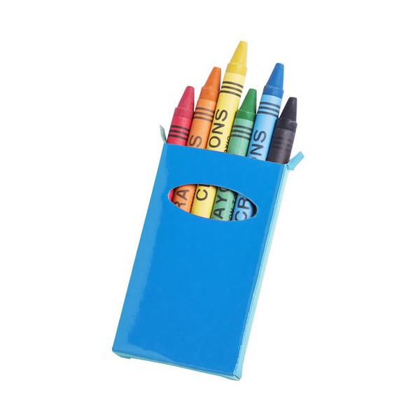 Set de 6 ceras en caja de cartón con acabado brillante en vivos colores y ventana. Con cuerpo cilíndrico en variados colores. En colores rojo, verde, amarillo, azul, negro, y naranja.