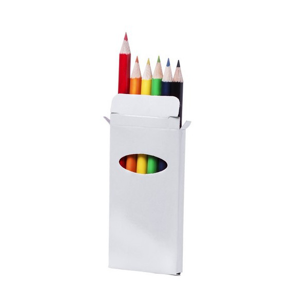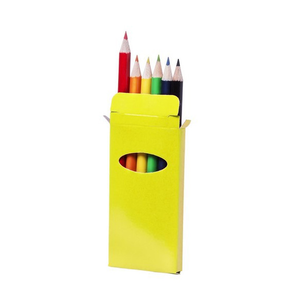 Set de 6 lápices en caja de cartón con acabado brillante en vivos colores y ventana. Lápices de madera con cuerpo cilíndrico en variados colores brillantes y minas en divertidos colores.