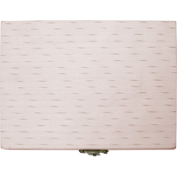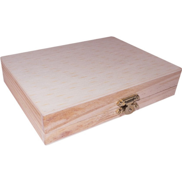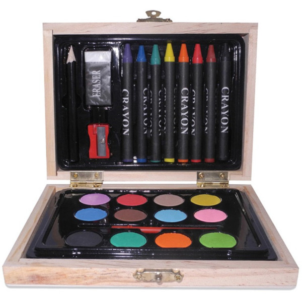 Set de dibujo en caja de madera. Con acuarelas, crayolas, pincel, lápiz negro, goma y sacapuntas.