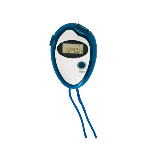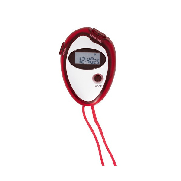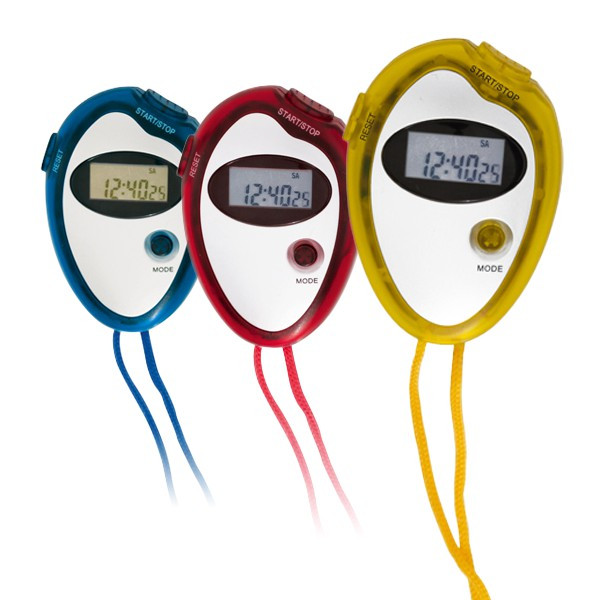 Cronómetro en original diseño bicolor con marco en alegres colores translúcidos. Con funciones cronómetro, reloj y alarma. Cinta para cuello a juego y pilas de botón incluidas con film de seguridad. Presentado en atractiva caja de diseño.
