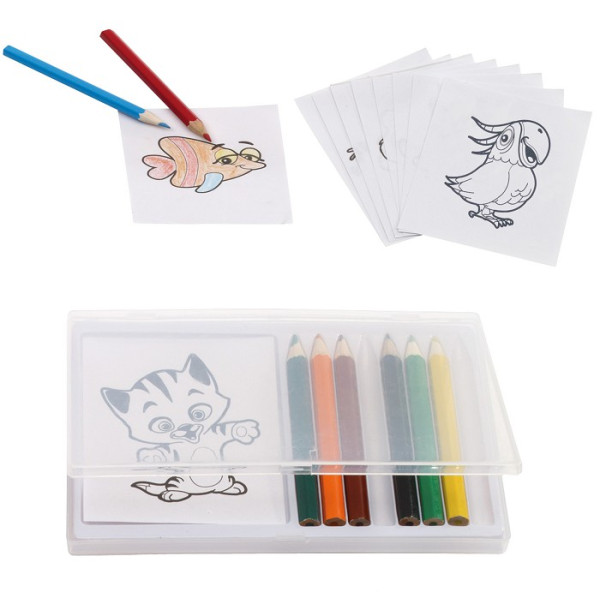 Set de pintura incluye 12 hojas con distintos animales para colorear y 8 lápices, en caja transparente.