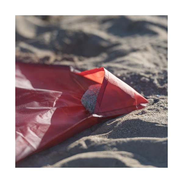 Esterilla para picnic en suave poliéster 190T de alta resistencia. En tamaño 145x105cm, con bolsillos en las esquinas para fijar con piedras o arena y cierre de cordón con accesorio de ajuste.