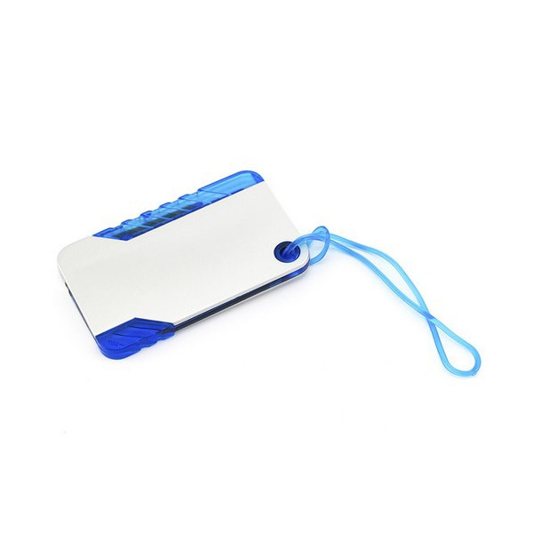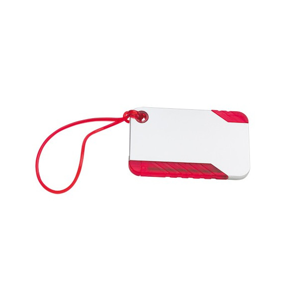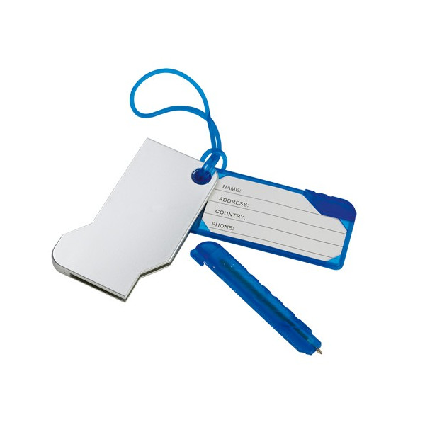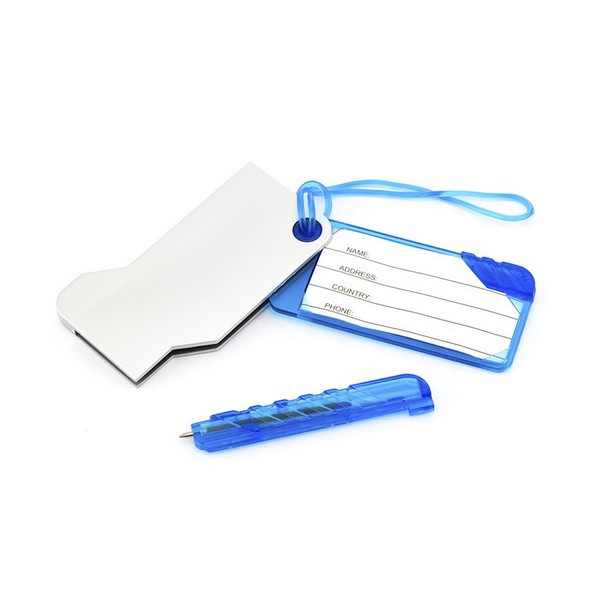 Identificador de maletas en original diseño bicolor. Con resistente tira de silicona y minibolígrafo -de tinta azul- a juego incluido.