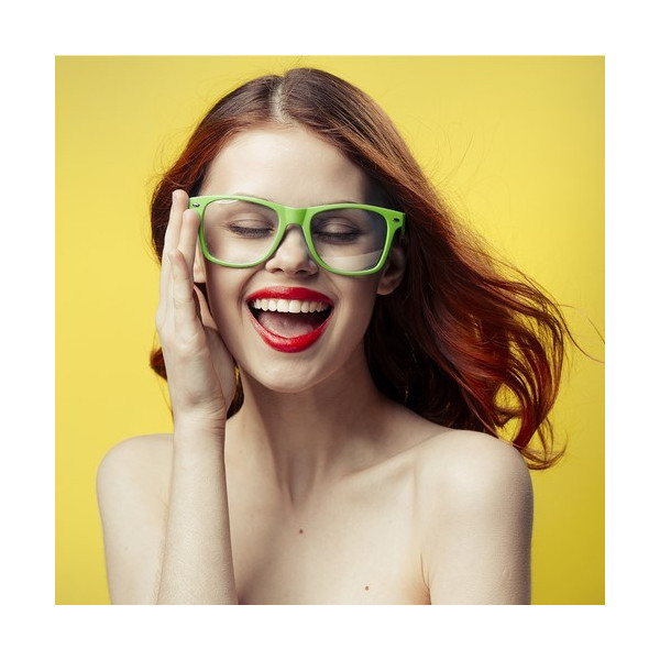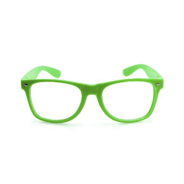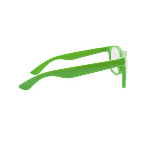 Divertidas gafas de clásico diseño con lentes transparentes y brillante montura en variada gama de vivos colores fluorescentes.