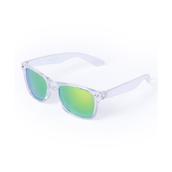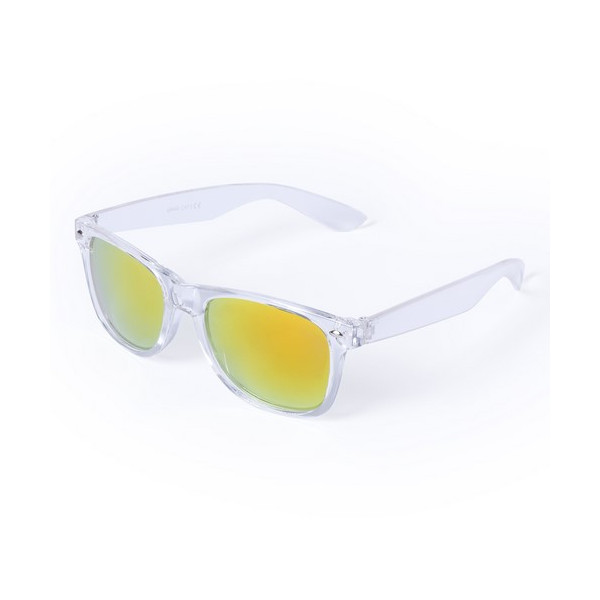 Lentes de sol con protección UV400 con marco transparente y lentes espejados.