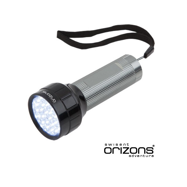 Linterna de Orizons de 28 ledes de alto poder de iluminación. Con resistente cuerpo en aluminio de diseño bicolor con mango antideslizante, pulsador protegido con recubrimiento de resistente goma y cinta de transporte. Alimentación a pilas: 3xAAA no incluidas. Presentada en atractiva caja de diseño con logotipo de la marca.