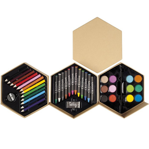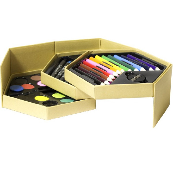 Cartón. Set de pinturas en forma de hexagono. 12 lapices de colores, 1 sacapuntas, 12 crayones, 1 goma de borrar, 12 acuarelas y 1 pincel.