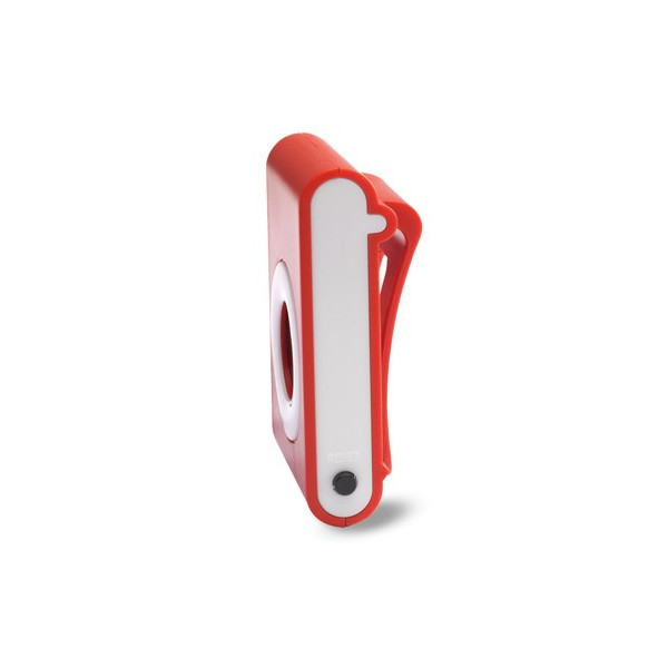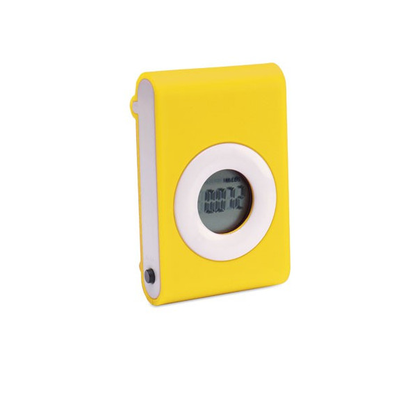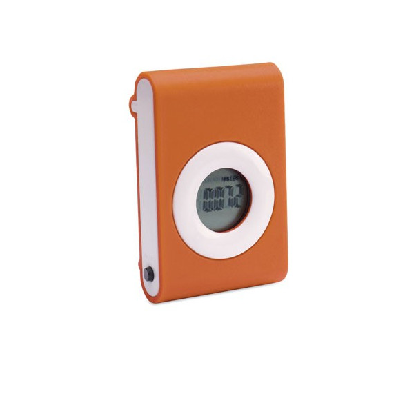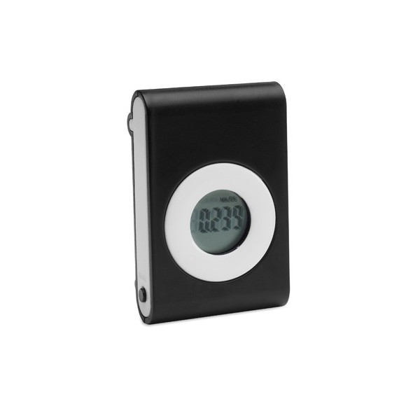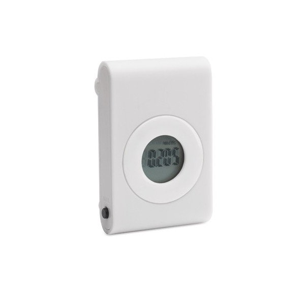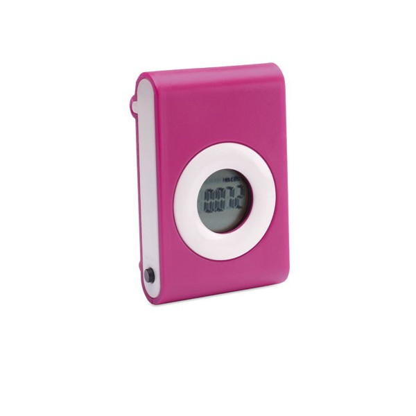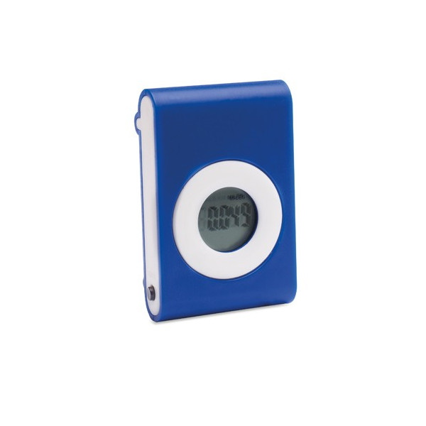 Práctico podómetro contador de pasos en original diseño bicolor con suave cuerpo en vivos tonos y pinza de fijación. Configurable con funciones: pasos, distancia recorrida y calorías consumidas. Pila de botón incluida con film protector y presentado en caja individual.
