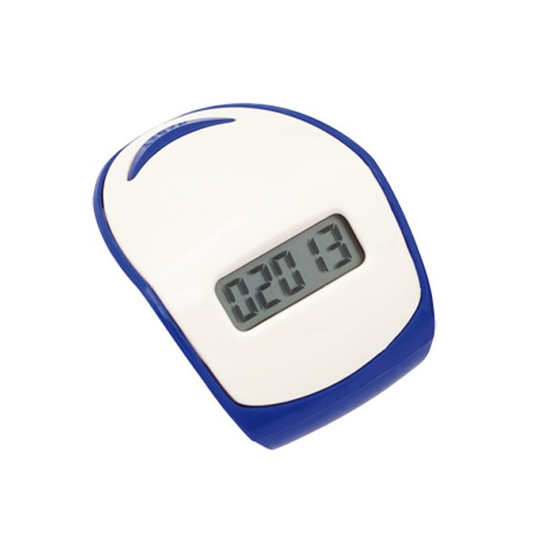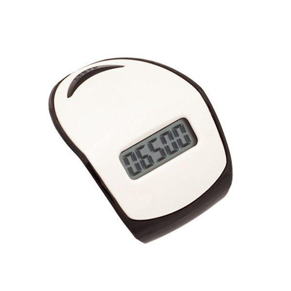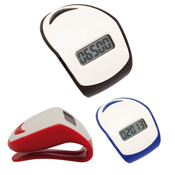 Práctico podómetro contador de pasos en original diseño bicolor con suave cuerpo, accesorios en vivos tonos y pinza de fijación. Pila de botón incluida y presentado en caja individual.