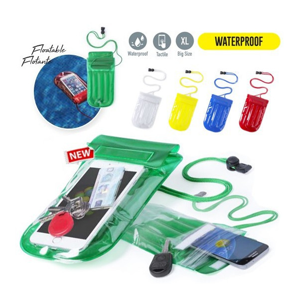Práctico porta-todo (portadocumentos) impermeable e inflable tamaño XL. En PVC con función táctil y doble sistema de seguridad para preservar la estanqueidad. Con zona de marcaje frontal a juego con el cordón de transporte -con accesorio de ajuste-.