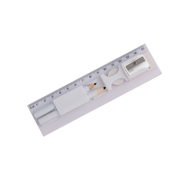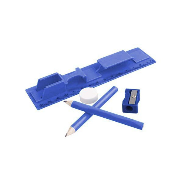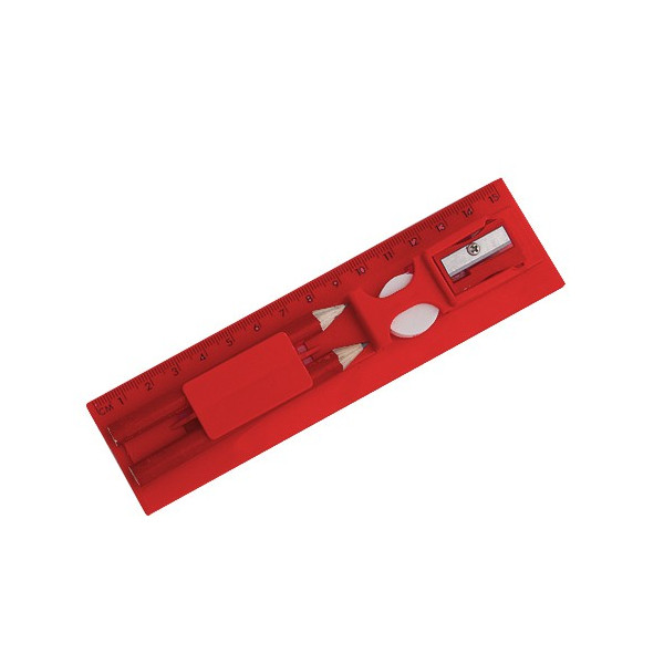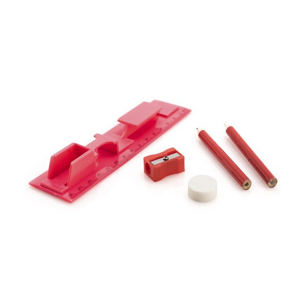 Set de 5 piezas en vivos colores. Incluye 2 lápices de mina negra con cuerpo cilíndrico, goma y sacapuntas. Presentado en estuche regla con compartimentos.