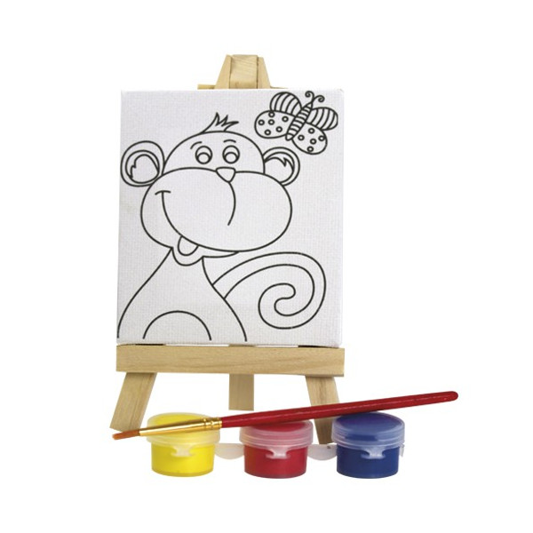 Divertido set de pinturas con lienzo para colorear disponible en 4 diseños. Incluye mini caballete de madera, 3 botes de temperas en vivos colores y pincel.