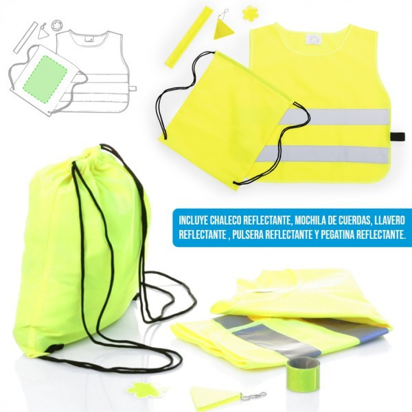 Set seguridad infantil en color amarillo de alta visibilidad. Incluye chaleco reflectante, mochila de cuerdas de 28x33cm, llavero reflectante en PVC, pulsera reflectante con mecanismo de ajuste automático y pegatina reflectante.