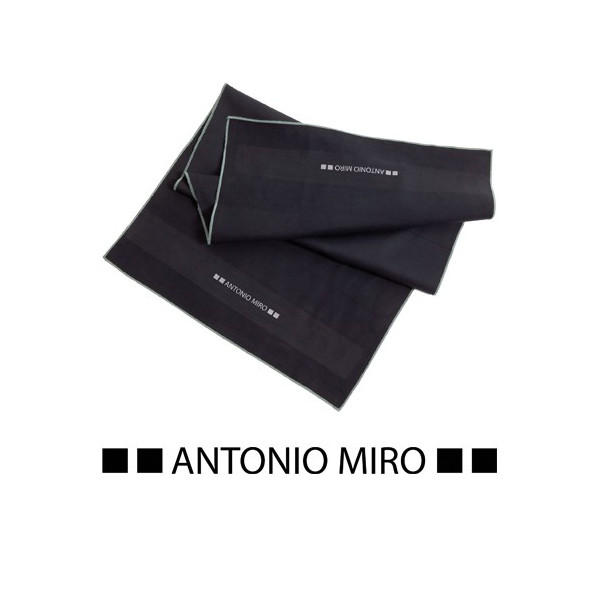 Toalla de 90x40cm de Antonio Miró en absorbente y suave microfibra de 200/m2 en sobrio diseño de color negro con costuras en color blanco y logotipo de la marca a juego.