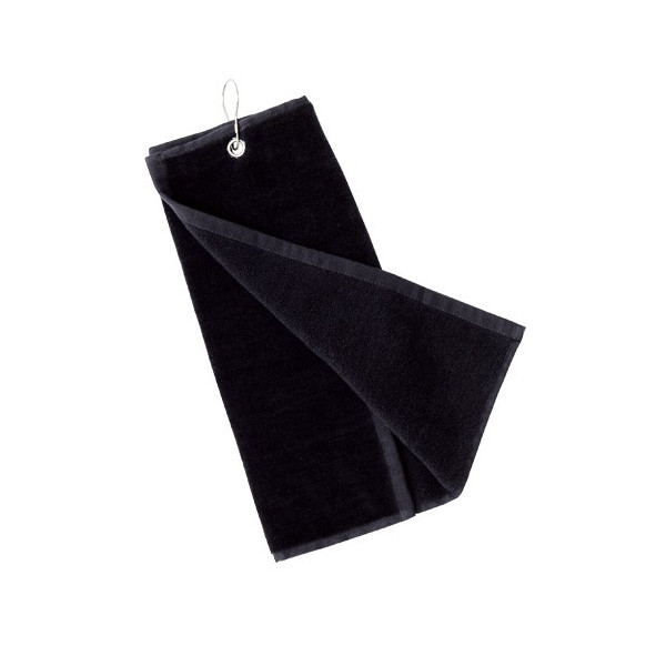 Toalla de golf de 40x50cm en absorbente y suave algodón de alta calidad de 650g/m2. Con argolla reforzada y mosquetón de acople, ambos de acero inox.