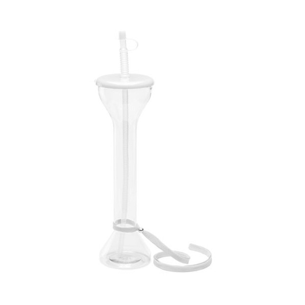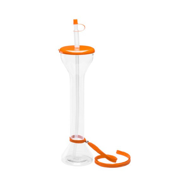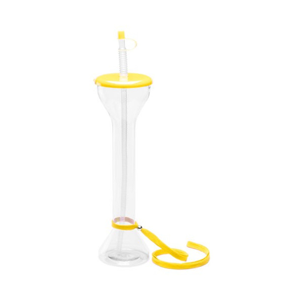 Divertido vaso de PET de 650ml de capacidad con cuerpo en transparente y accesorios en variada gama de vivos colores. Con pajita flexible y cinta de transporte en poliéster con accesorio de ajuste.