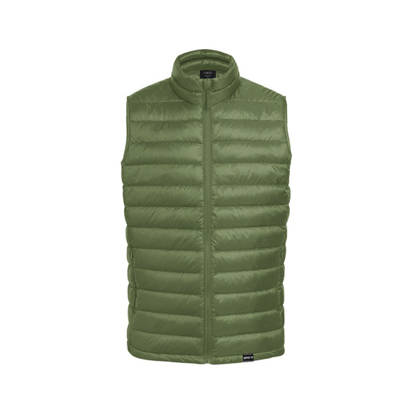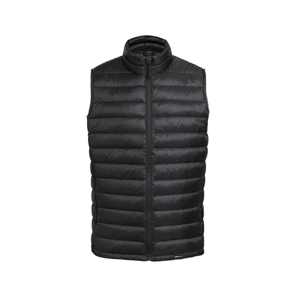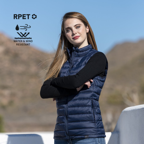 En material extra ligero efecto pluma, resistente al agua y cortavientos, con acolchado interior. Cremallera de cuello con tapeta y cinta en tirador, amplios bolsillos laterales con cremallera. Distintivo RPET en etiqueta y disponible en variada gama de colores.